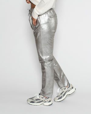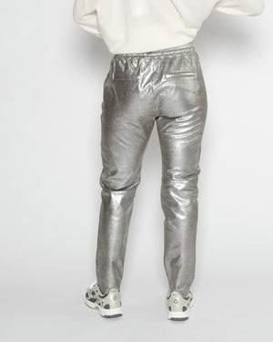 Pantalon en cuir métallisé de la marque Oakwood. Vous allez adorer ce pantalon argenté, son cuir souple et lisse le rendent unique et d'une excellente qualité. L'élasticité de la taille permet de marquer votre silhouette tout en alliant le confort ! Son style métallisé rend cette pièce top tendance pour la saison hivernale !