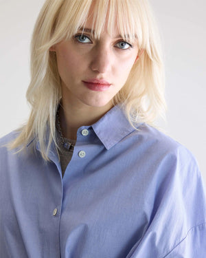 Coupe oversize / Épaules tombantes / Col classique boutonné sur le devant / Broderie "blr" sur le devant / Deux boutons latéraux pour ajuster la coupe