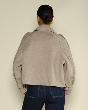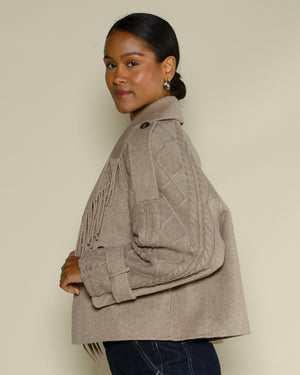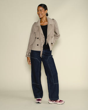 Manteau Notshy court / Coupe droite moderne / Large col à revers avec franges décoratives / Fermeture croisée à double boutonnage / Manches longues en maille torsadée