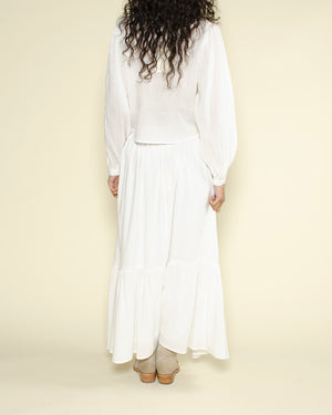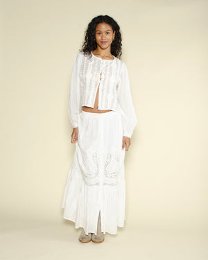 Une jupe longue blanche aux ambiances bohèmes de la marque Maison Hôtel. Portez cette jupe pour femme l'été avec des talons hauts pour les soirées ou avec des sandales pour un look plus citadin ! Il s'accorde parfaitement avec sa blouse à broderie assortie.
