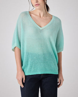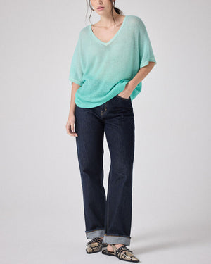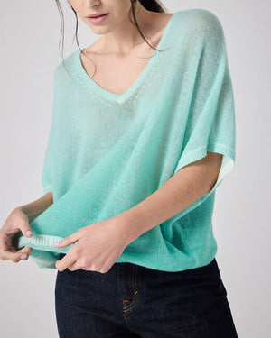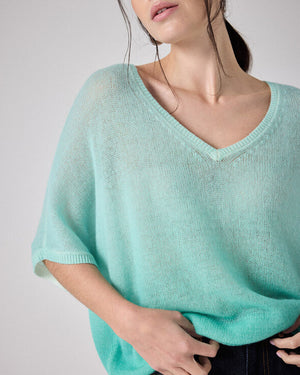 Un pull en cachemire de couleur acqua et ice pour femme de la marque Notshy. On adore ce pull pour femme avec sa matière cachemire hyper douce et confortable.