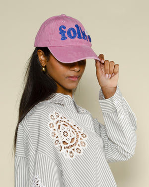Casquette Newtone / Coupe baseball classique / Visière courbée / Broderie pailletée “Folk” bleu roi / Matière coton effet usé / Coloris rose vintage