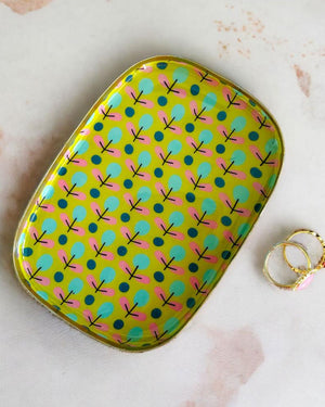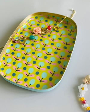 Mini plateau avec des dessins floraux dans des teintes de couleurs douces. Un vide poche très pratique pour poser vos bijoux.