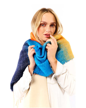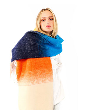 Dimensions généreuses et enveloppantes / Dégradé multicolore bleu marine, bleu cyan, jaune, orange et beige / Franges beiges aux extrémités / Style élégant et décontracté avec inspiration amérindienne