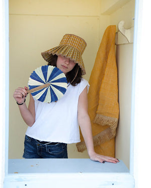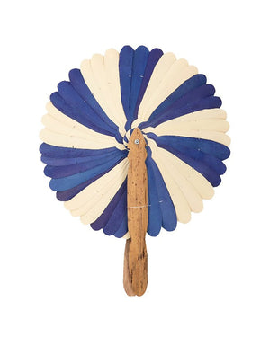L'éventail bleu et beige de la marque The Nice Fleet. On adore cet éventail en feuille de palmier naturel possédant un manche en tronc de bambou.