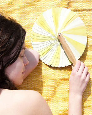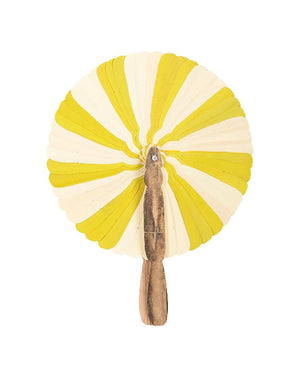 L'éventail jaune et beige de la marque The Nice Fleet. On adore cet éventail en feuille de palmier naturel possédant un manche en tronc de bambou.