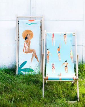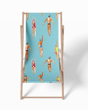 La toile pour transat Stinson de la marque The Nice Fleet. On adore cette toile au motif aquarellé de nageurs et nageuses sur un fond turquoise. Pratique et amovible, elle peut se retirer pour la nettoyer ou pour la changer au grès de vos envies.