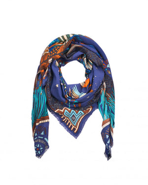 Grand modèle / Coiffe indienne et symboles tribaux / Motifs bracelets brésiliens et détails étoiles, plumes, bordures / Fond bleu, motifs turquoise, caramel, marron, beige ivoire & kaki / Polyvalent : foulard, paréo, turban, accessoire sac