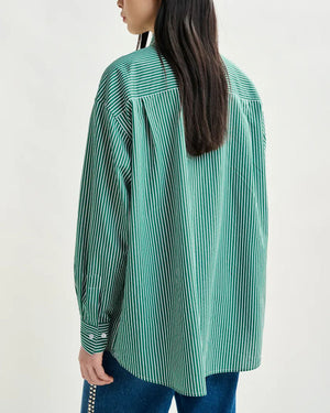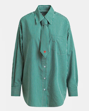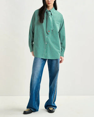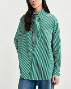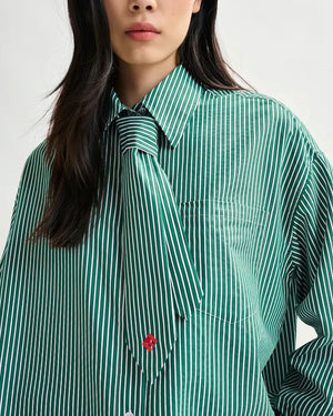 Chemise boxy / Coton mélangé vert et blanc / Coupe ample et courte / Emmanchures basses / Ourlet incurvé / Poche poitrine / Pattes d’épaules boutonnées / Fermeture par boutonnage / Cravate amovible