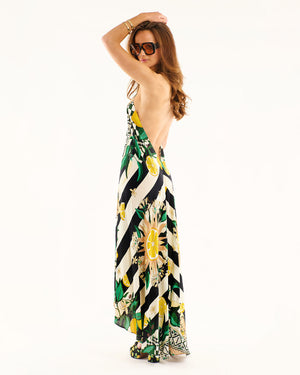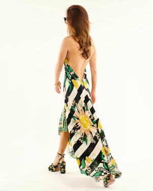 La robe Wild à l’ambiance ensoleillée de l'Italie du Sud. Avec des motifs inspirés des citrons siciliens, des boîtes de sardines, des piments rouges et des feuilles d'olivier, elle incarne l'esprit du Sud sur fond blanc à rayures noires et bleues. Cette robe longue 7/8ème légèrement asymétrique avec un décolleté profond et un nœud derrière la nuque offre un effet traîne chic. Parfaite pour les journées d'été, elle apporte une touche féminine et élégante à votre look. Découvrez toute la collection Wild ici