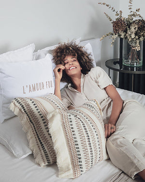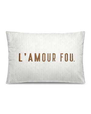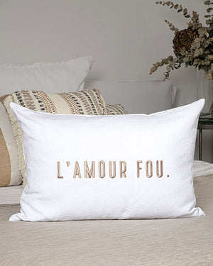 Un coussin blanc à message de la marque Pôdevache. On aime ce coussin rectangulaire blanc avec le message "L'amour Fou" brodé en doré sur le devant. Ce coussin alliant élégance et confort saura décorer votre intérieur à la perfection.