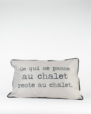 Coussin de la marque Podevache avec un écrit amusant et décalé."Ce qui se passe au chalet reste au chalet."