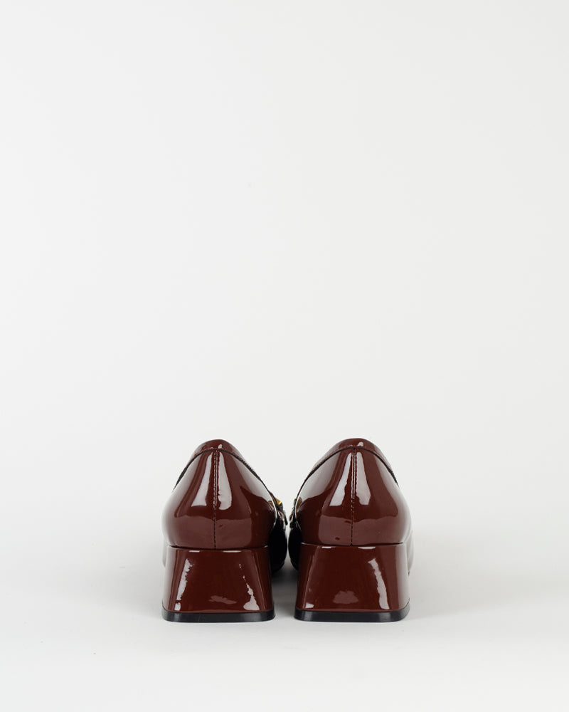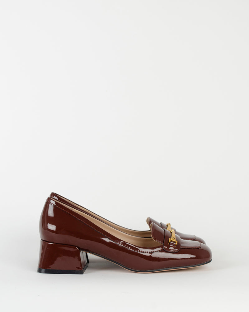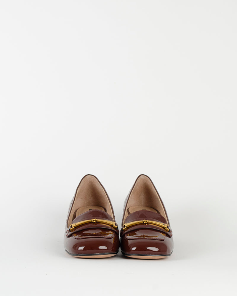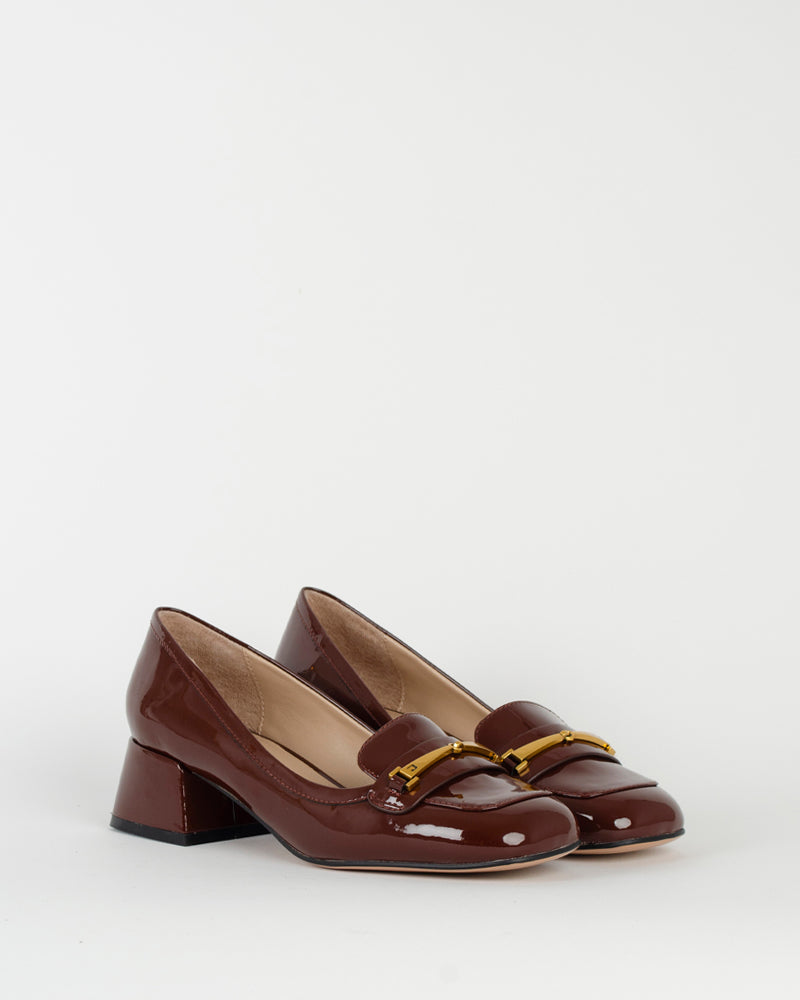 Un escarpin à talons avec un mors sur le devant de la chaussure. Une paire tendance qu'on va porter tout l'hiver avec un jean ou une jupe longue ! La couleur entre le cognac et le bordeaux est au top de la tendance de cet automne !