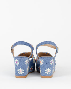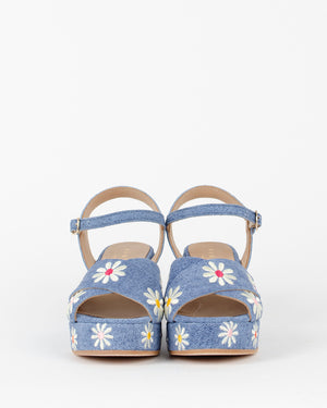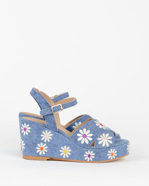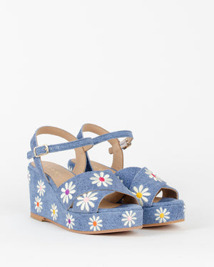 Sandales compensées pour femme de la marque Fiorina Coloris : Denim et Fleur Composition : Cuir et toile Denim Talons: 7 cm