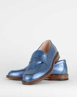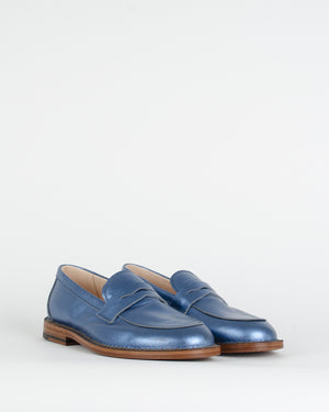 Une paire de mocassins bleue pour femme de la marque Pantanetti, parfaite pour ce printemps ! Le cuir italien de la chaussure la rend confortable et idéale pour les tenues chics.