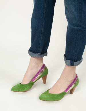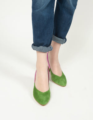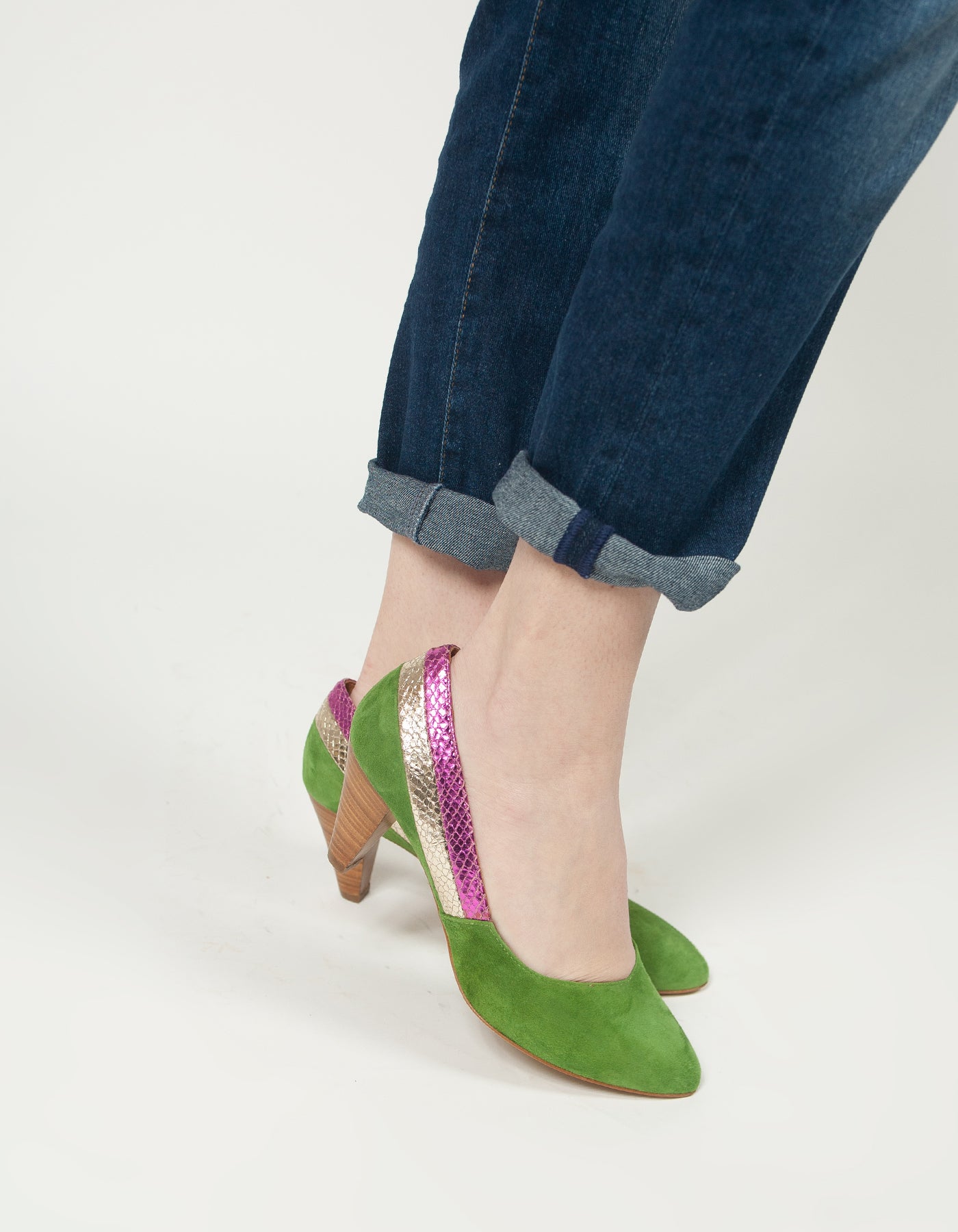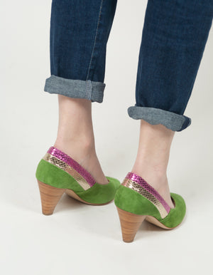 Escarpins de couleur vert et rose avec deux bandes argentées à l'arrière esprit serpent.