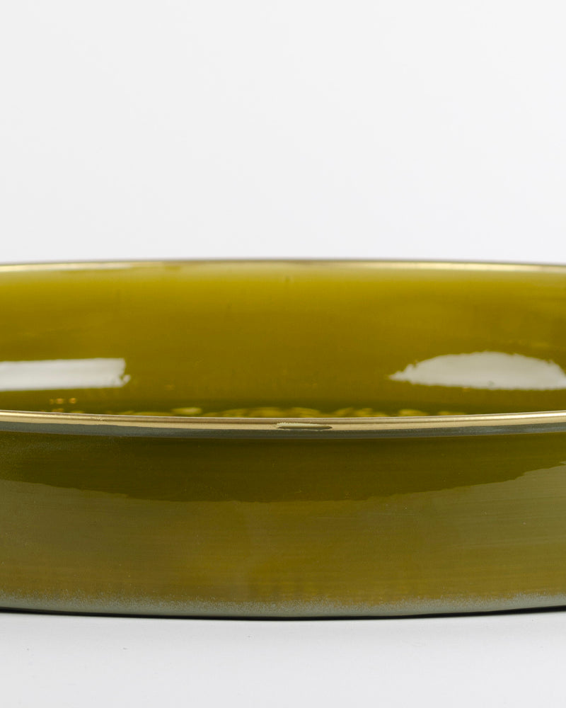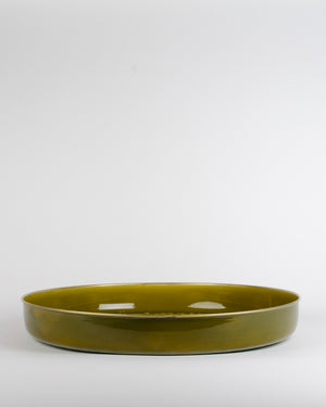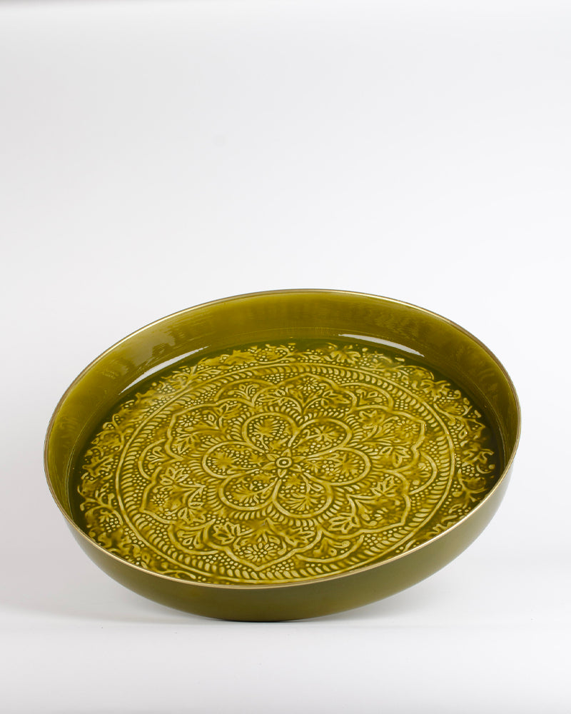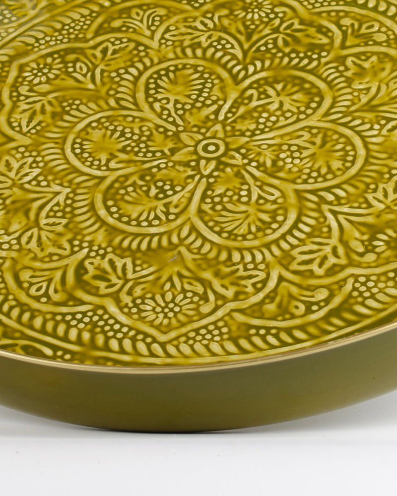 Un plateau de 50cm de diamètre de couleur verte avec un relief ethnique. Vive la folie des grandeurs !