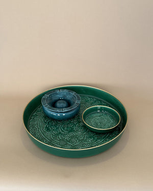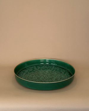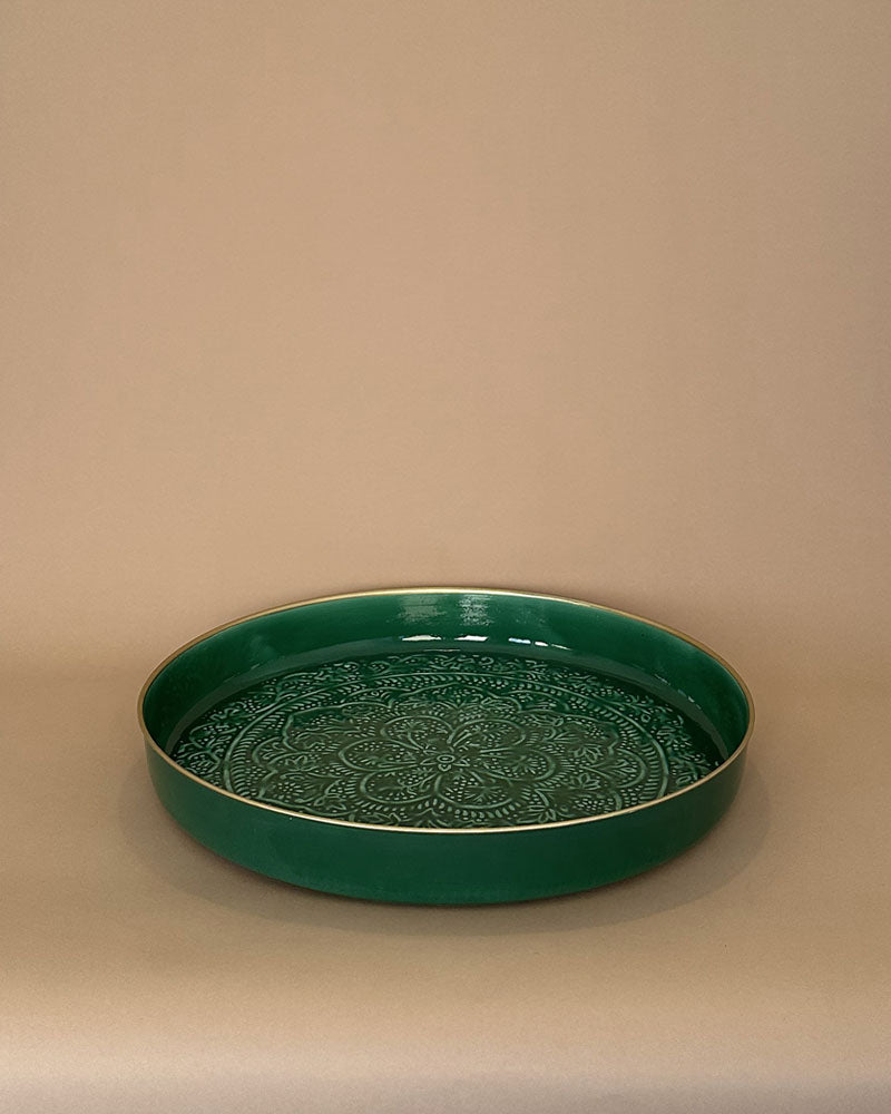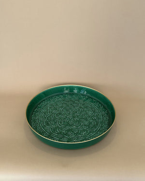 Un plateau de 50cm de diamètre de couleur verte avec un relief ethnique. Vive la folie des grandeurs !