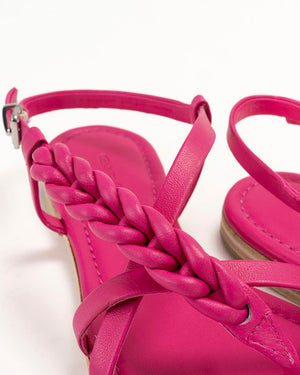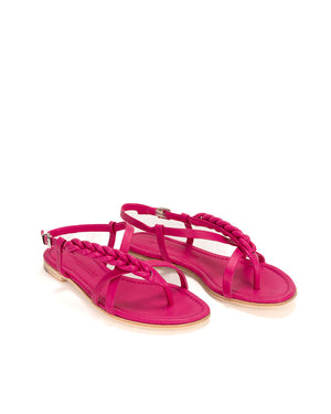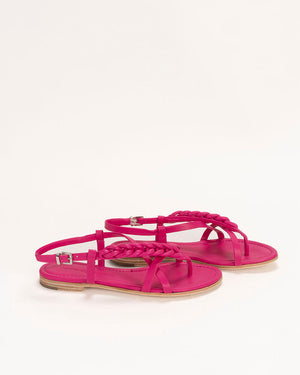 Paire de sandales en cuir fushia, brides fines et bride tressée sur le côté droit.