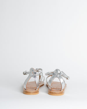 Ces sandales plates en cuir argenté de la marque K. jacques sont fabriquées à la main à St-Tropez en France. Ces tropéziennes sont faciles à porter avec toutes vos tenues estivales.