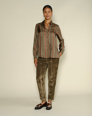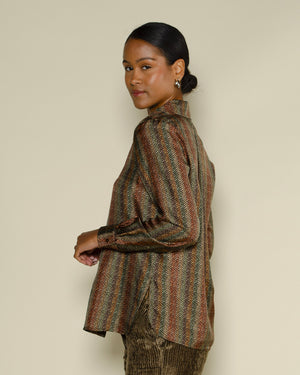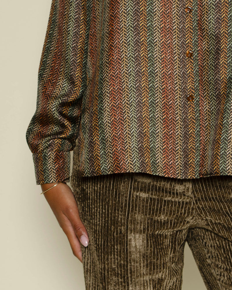 chemisier légèrement surdimensionné / col mandarin et patte de boutonnage dissimulé / fentes latérales et manche précieuse avec poignet à boucle froncée