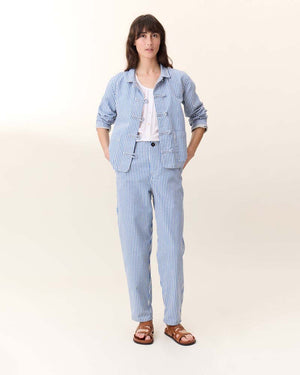 Pantalon Armina de la marque Leon and Harper. On adore les détails "cargo" sur les côtés et sa coupe droite. L'imprimé rayé bleu et blanc fait de ce pantalon une pièce ultra-tendance. On l’imagine parfaitement associé à un joli tee-shirt oversize pour un look moderne et streetwear !