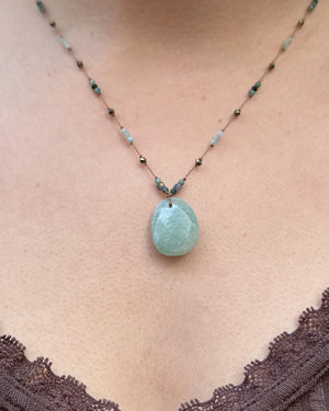Collier attrape-rêve de la marque Paline de Papioka. Ce collier fait main met en valeur une magnifique pierre d'amazonite, une pierre de protection, qui agit sur la communication et l’harmonie, créant une aura de tendresse et de douceur. Ce bijou allie élégance artisanale et énergie spirituelle.