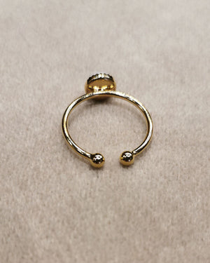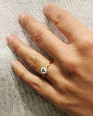 Bague en perle de céramique sérigraphiée avec un coeur sur une base en plaqué or. Bague réglable