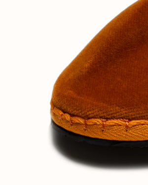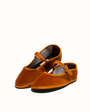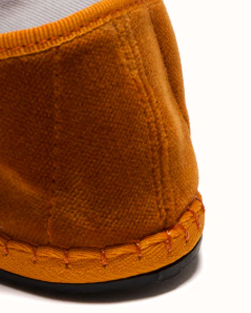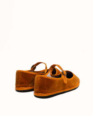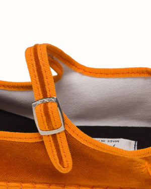 Cette ballerine a embout arrondi bi-matière est en velours orange. Rebords en gros grain noir. La semelle intérieure est en coton beige, et la semelle extérieure est en gomme noire à résistance renforcée.Fermeture avec boucle ajustable.Fabriquées à la main en Italie.