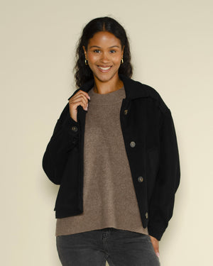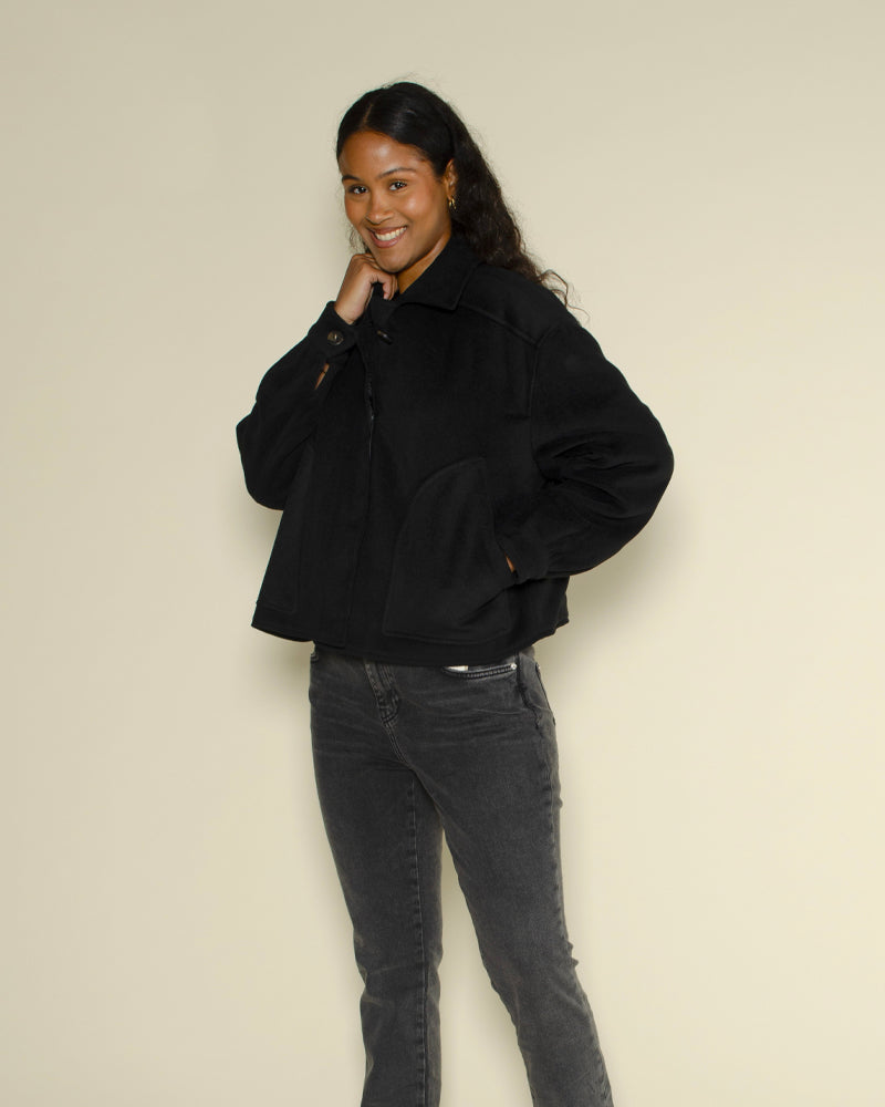 veste courte / coupe légèrement crop / silhouette structurée / mêle esprit utilitaire et élégance décontractée / à porter aussi bien ouvert que boutonné.