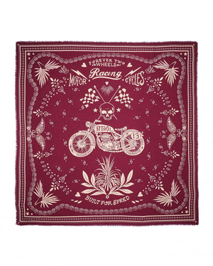 Grand modèle / Foulard biker chic / Imprimé tête de mort et moto / Fond bordeaux féminin / Motifs fleurs, étoiles & cachemire / Accessoire versatile (foulard ou paréo)