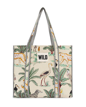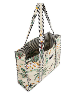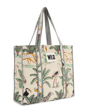 Pratique et iconique, le sac Bautista, avec son imprimé inspiré de la jungle, capture l’essence de l'Amazonie. Les panthères, cigognes et palmiers sont harmonieusement disposés sur un fond beige. On adore ce sac pour femme pour la plage cet été. Découvrez le ici en noir.