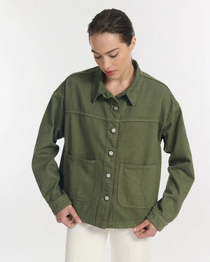 Une veste en jean kaki pour femme de la marque Labdip. On adore cette veste avec ses deux poches carrées plaquées à l'avant, très style workwear ! Facile à porter tous les jours, elle vous garantira confort et style.