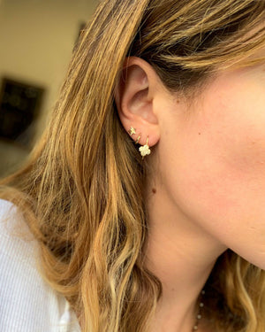 Une paire de boucles d'oreilles dormeuse de la marque Sophie Deschamps qui fait chavirer notre coeur ! Elles sont ornées d'un pavage de zircons blancs. Le zircon est une vraie pierre fine qui a de multiples couleurs dont le blanc (incolore) qui ressemble au diamant !