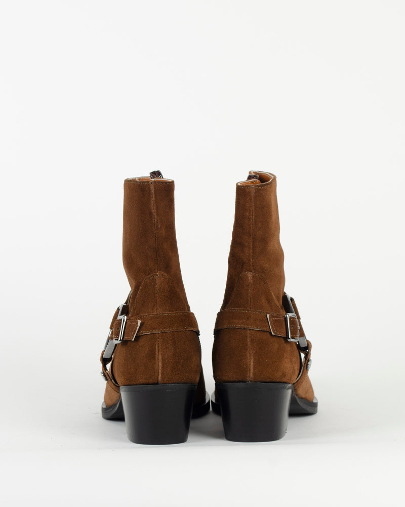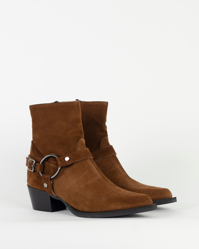 Des santiags en cuir suédé de couleur marron cognac et de la marque Les Venues. On est fan de ces santiags marron cognac pour femme en cuir suédé, confortables et ultra tendance !