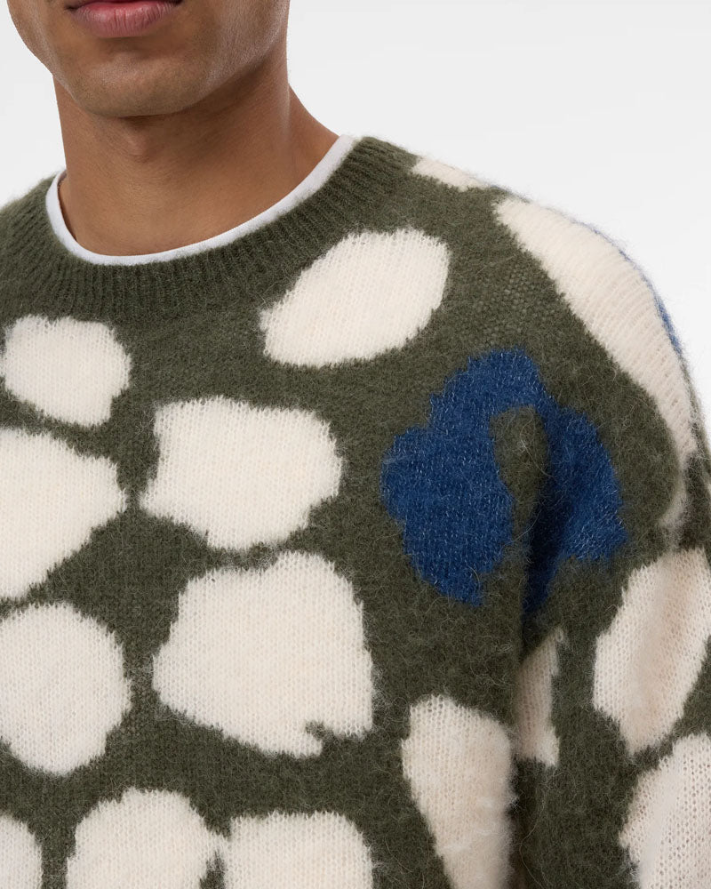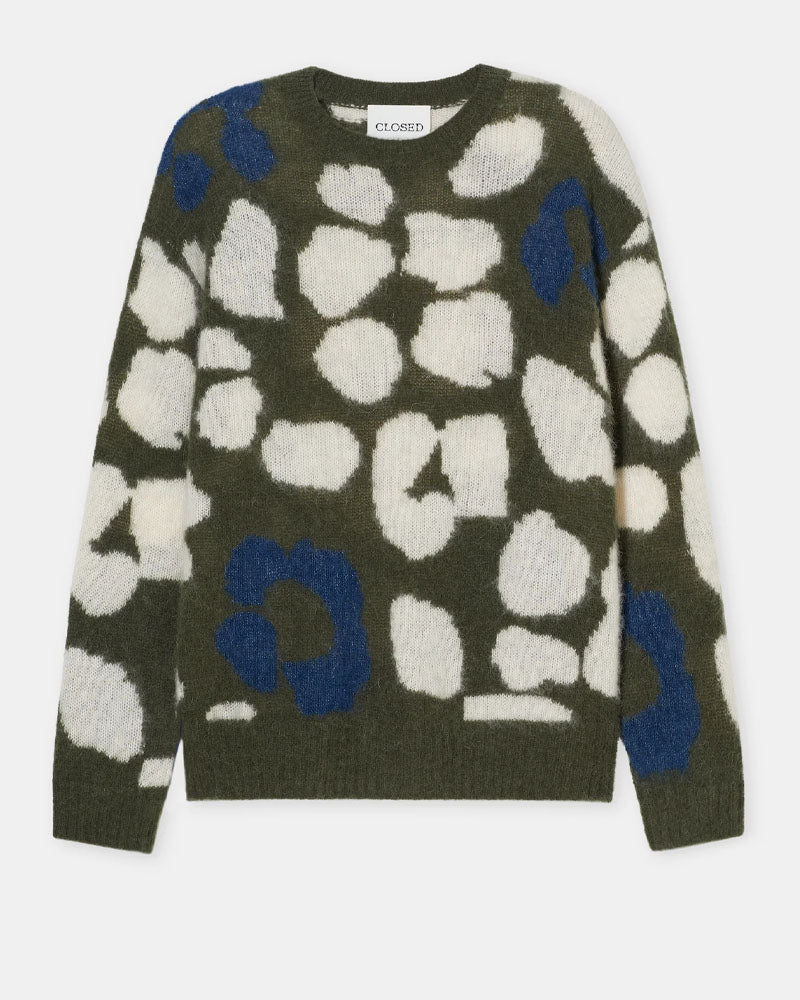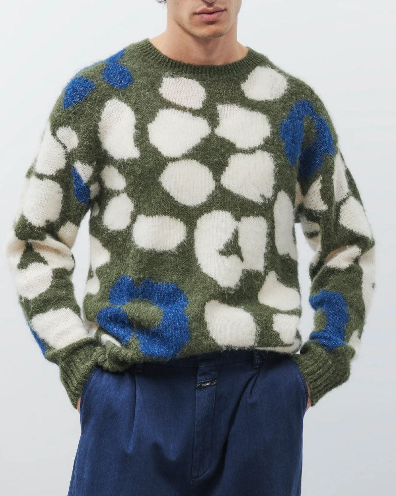 Coupe décontractée / Maille fine / Motif floral intarsia sans couture / Col et poignets côtelés / Finition confortable et structurée
