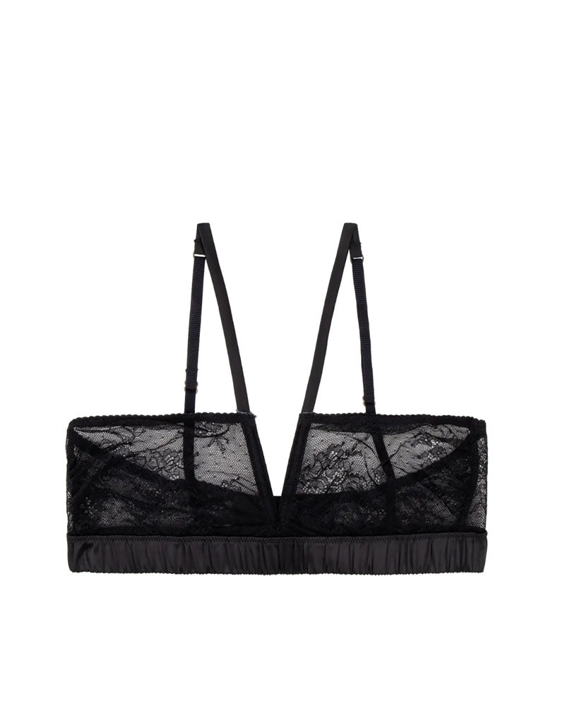 Le soutien gorge est non rembourrée noir, il est en dentelle avec des motifs floraux. La coupe est flatteuse avec un décolleté en V ainsi que des détails froncés sur le buste. Les bretelles sont réglables, ainsi que la fermeture à l'arrière.