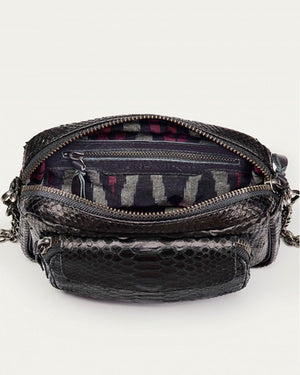 Un sac bandoulière en python de couleur noir très chic. Il dispose de plusieurs espaces de rangement pour vous permettre de vous balader avec votre attirail ! On adore la forme intemporelle du Charly !