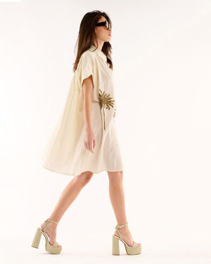 Véritable pièce phare de la saison, la robe Clovis incarne féminité et raffinement. Inspirée du thème estival "Palmiers", cette robe chemise oversize est confectionnée en gaze de coton et sublimée par des broderies artisanales de palmiers, ornées de perles de rocaille dorées et gun. Son petit col, ses manches courtes amples, et ses boutons dorés ajoutent une touche précieuse et sophistiquée à cette création unique. Retrouvez ici la robe Clovis en noire ! Retrouvez la ici en noire !