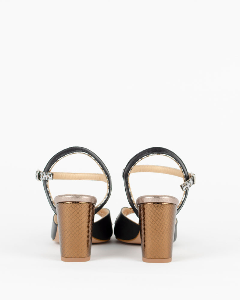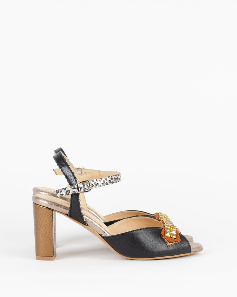 Optez pour cette paire de sandale à talon de la marque Créatis. Ces sandales pour femme sont originales et sophistiquées, de part les différentes couleurs et motifs utilisés. Elles sont composées de fines lanières ajustables et d'un super détail clouté à l'avant.