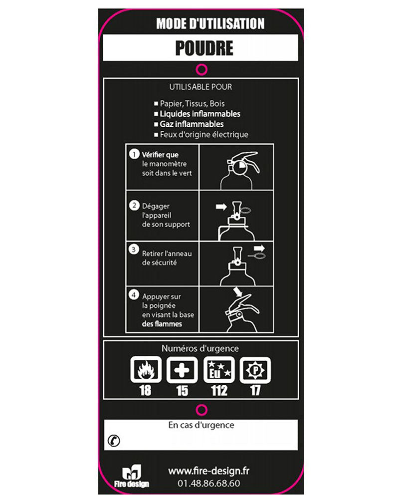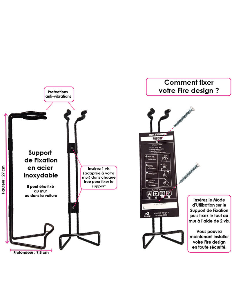 Chaque Appareil d'Extinction Fire design est vendu avec son support de fixation.Vous pouvez le fixer au mur (recommandé) et vous pouvez aussi l'utiliser pour le fixer dans votre automobile.
