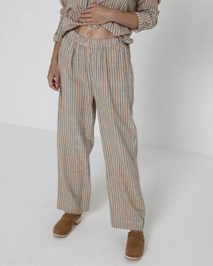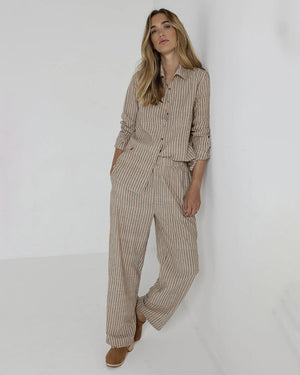 Le pantalon beige pour femme Daria de chez Charlie Joe. On craque pour sa coupe droite ample et ses rayures bleues foncées ultra tendance ! Ce pantalon est à la fois élégant et confortable grâce notamment à sa taille élastique et ses poches italiennes.