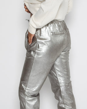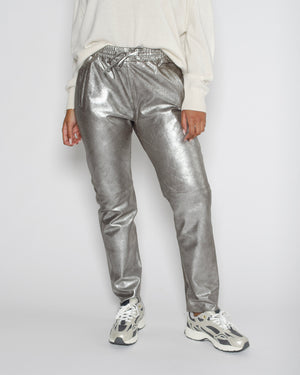 Pantalon en cuir métallisé de la marque Oakwood. Vous allez adorer ce pantalon argenté, son cuir souple et lisse le rendent unique et d'une excellente qualité. L'élasticité de la taille permet de marquer votre silhouette tout en alliant le confort ! Son style métallisé rend cette pièce top tendance pour la saison hivernale !