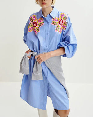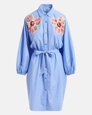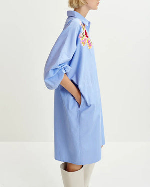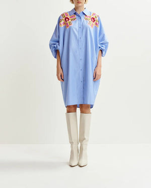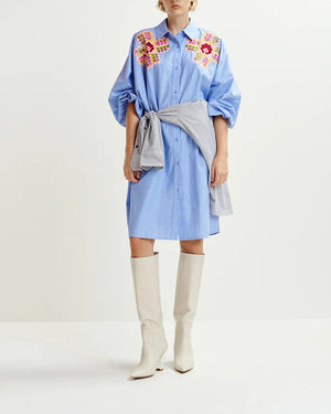 Cette robe chemise bleu rayé à broderies de chez Essentiel Antwerp est un must have de la garde robe estivale. Avec des petites sandales ou des talons compensés on adore. Retrouvez toute la collection Essentiel ici !