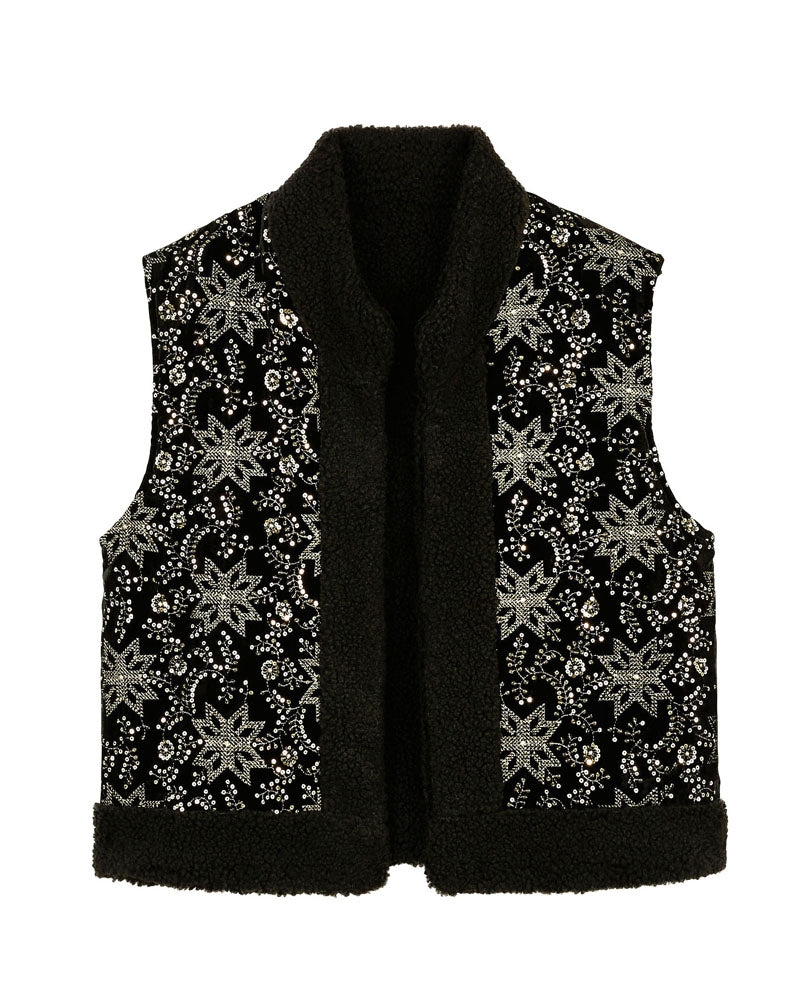 Gilet fantaisie sans manches noires, à superposer sur un pull ou une tunique.