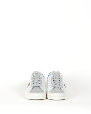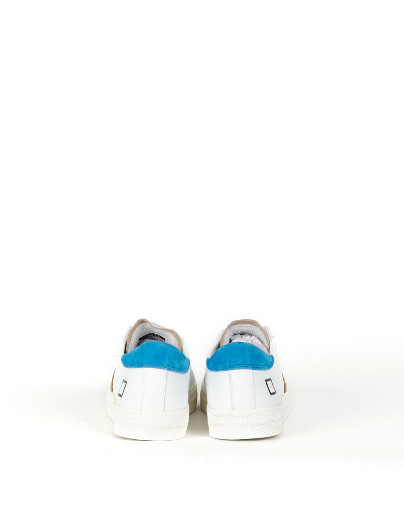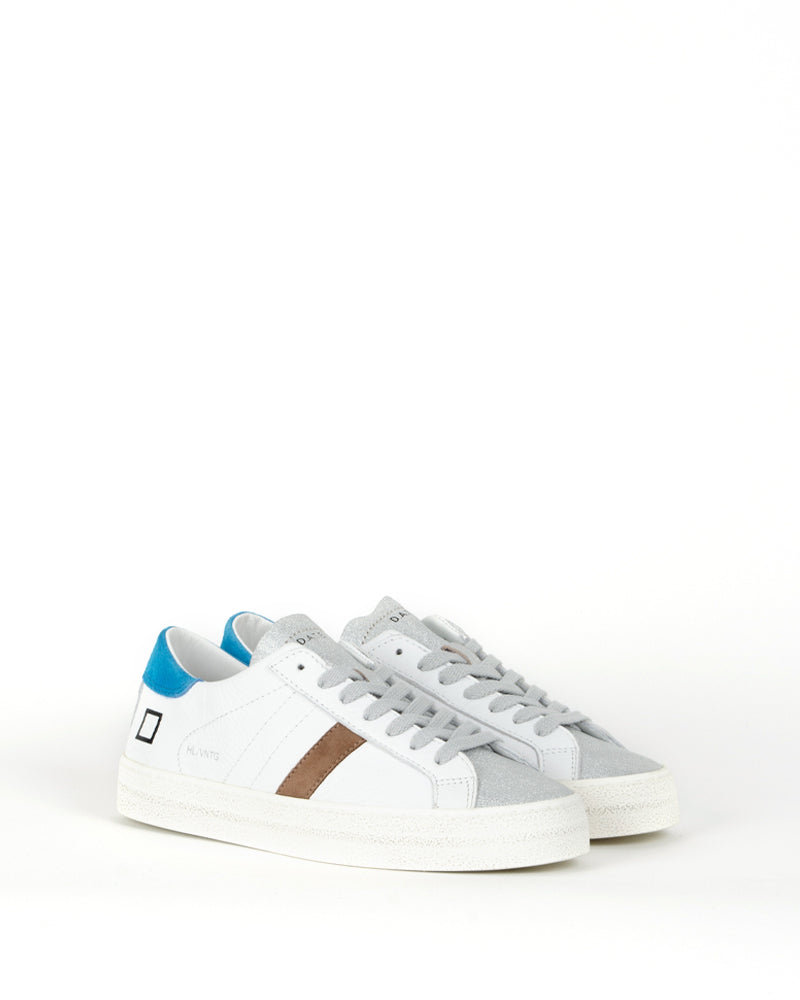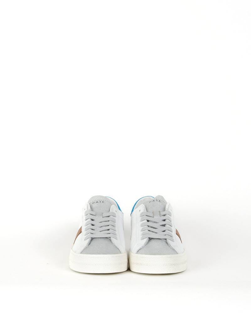 Baskets de la marque Date Coloris : Argent Composition : Les lacets sont en coton et le logo carré est brodé sur le coté, La bande latérale est en cuiR bluette, Le petit talon derrière est en cuir jaune ocre, La semelle intérieure est surélevée de 2.5cm pour plus de confort, La semelle en caoutchouc texture ciment est haute 2.5cm, est cousue et un peu sale pour un effet used Une paire de baskets citadine basse de couleur blanche, bleu et marron. On craque pour ce style décontracté avec la basket de ville !