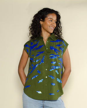 Une chemise sans manches à sequins kaki pour femme de chez Essentiel Antwerp, parfaite pour cette saison. On adore les sequins effet sirène qui ajoute une touche de peps à la tenue.
