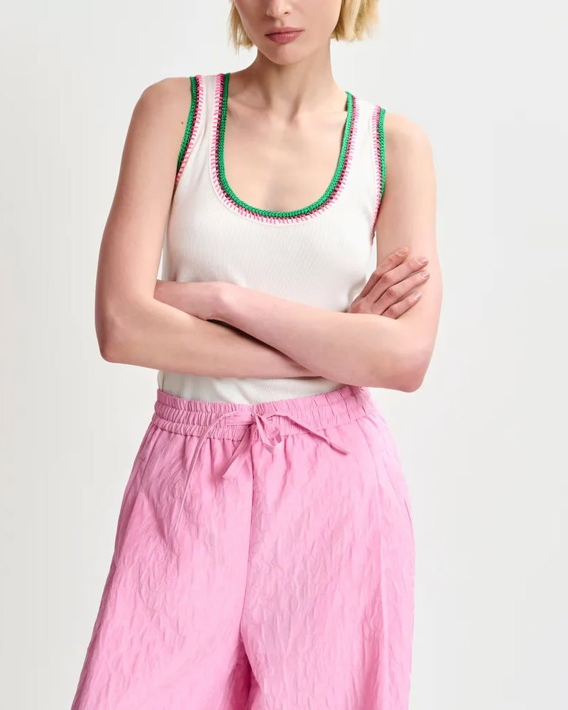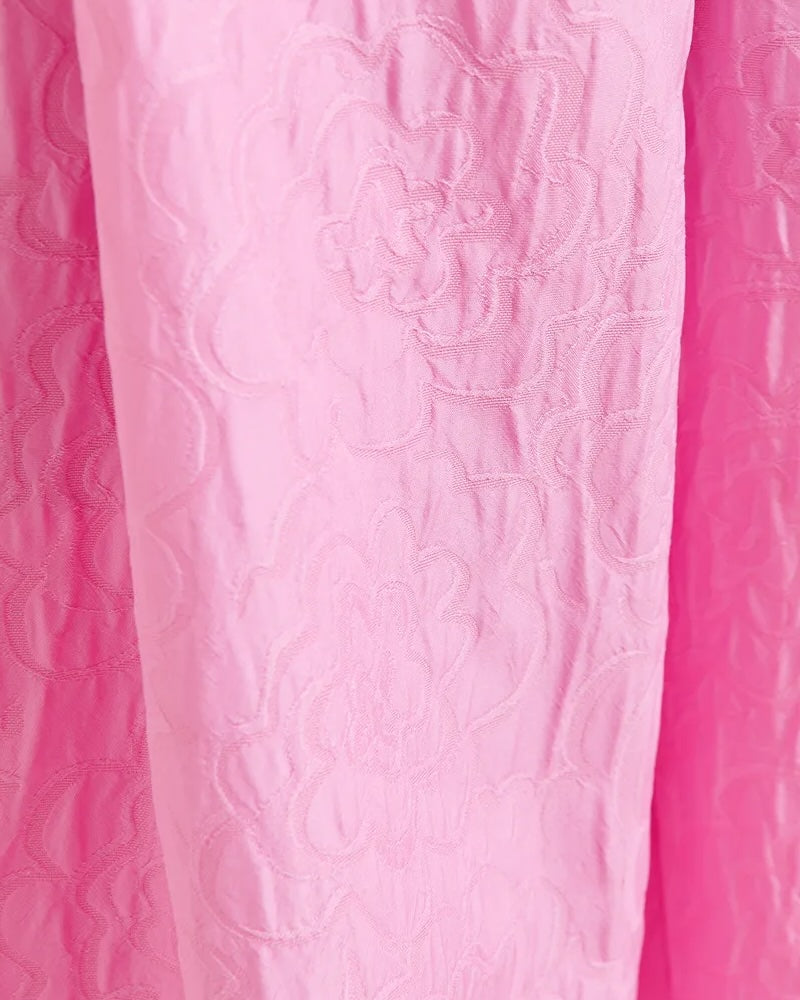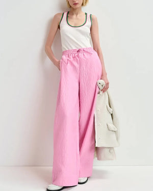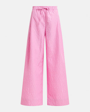 Un pantalon rose texturé pour femme de chez Essentiel Antwerp, parfaite pour cette saison. On adore la coupe évasé et la couleur peps de ce pantalon.