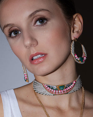 Créoles brodées à la main en cuir et fil de soie, serties de pierres semi-précieuses taillées en triangle et de perles en laiton. Elles sont doublées de cuir souple pour un confort optimal et dotées de crochets en laiton inoxydable, hypoallergéniques. Astucieuses, elles peuvent se porter en demi-cercle ou avec les attaches fournies, selon vos envies. Un bijou raffiné qui allie savoir-faire artisanal et élégance contemporaine. Découvrez Nahua ici !
