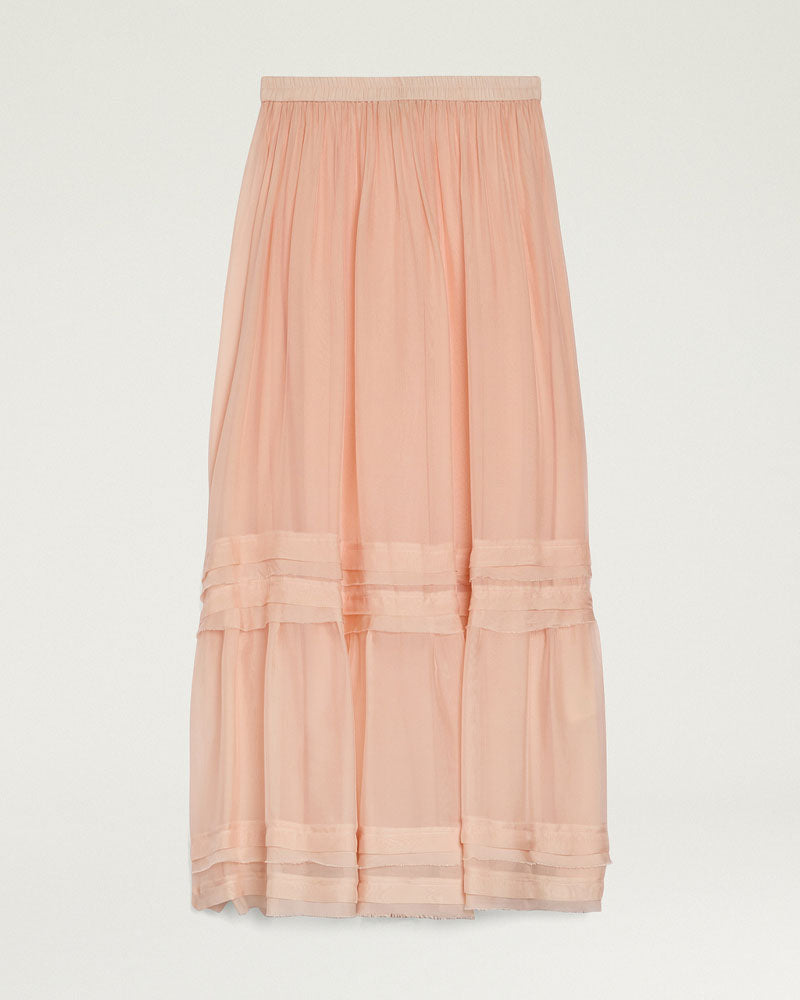 Jupe Hopi / mousseline viscose-soie / ceinture élastiquée / taille froncée / longueur midi / volant froncé bas de jupe / détails rubans satin / détails rubans mousseline / finitions coupées à vif